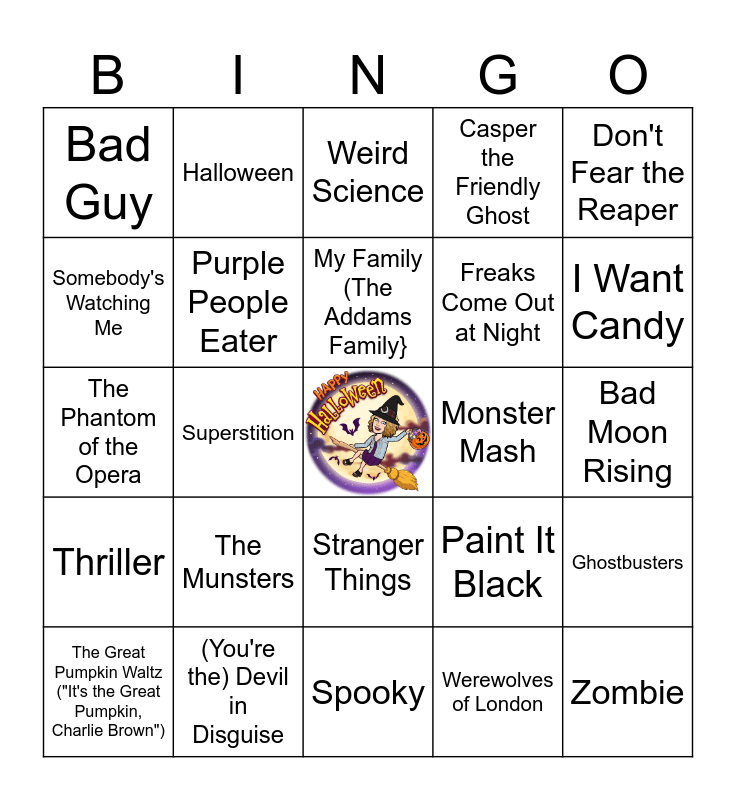 This bingo card has a free space and 28 words: Ghostbusters, Vampire, Freaks Come Out at Night, Werewolves of London, Somebody's Watching Me, Weird Science, Halloween, Thriller, Monster Mash, The Great Pumpkin Waltz ("It's the Great Pumpkin, Charlie Brown"), The Phantom of the Opera, Casper the Friendly Ghost, (You're the) Devil in Disguise, Spooky, I Want Candy, A Nightmare on My Street, The Munsters, Purple People Eater, My Family (The Addams Family}, Stranger Things, Bad Guy, Spooky Scary Skeletons, Zombie, Superstition, Bad Moon Rising, Paint It Black, Don't Fear the Reaper and Devil Inside.