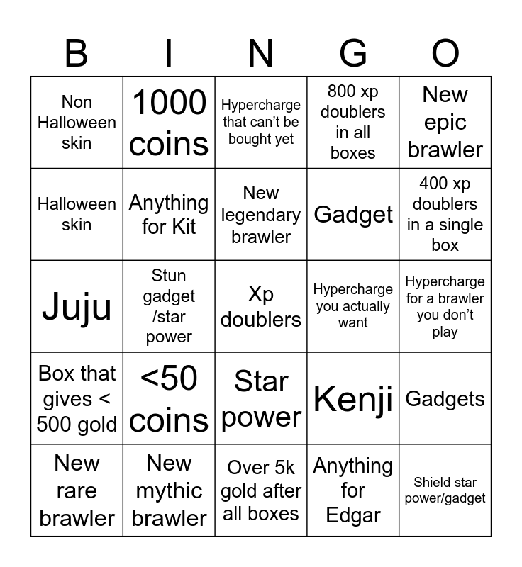 This bingo card has a free space and 24 words: <50 coins, New mythic brawler, New legendary brawler, New rare brawler, New epic brawler, Non Halloween skin, Halloween skin, 1000 coins, Hypercharge you actually want, Star power, Gadget, Juju, Kenji, Gadgets, Anything for Kit, Anything for Edgar, Hypercharge for a brawler you don’t play, Hypercharge that can’t be bought yet, 400 xp doublers in a single box, Stun gadget /star power, Shield star power/gadget, Box that gives < 500 gold, 800 xp doublers in all boxes and Over 5k gold after all boxes.