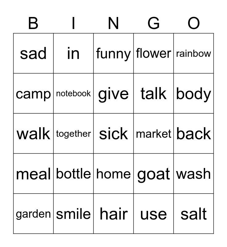 This bingo card has a free space and 24 words: garden, bottle, give, use, rainbow, sad, in, funny, market, back, walk, notebook, goat, wash, camp, smile, hair, flower, body, meal, together, home, talk and salt.