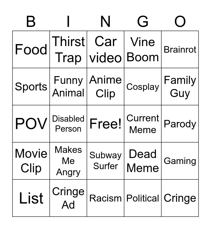 This bingo card has a free space and 31 words: Racism, 9/11, Disabled Person, Actually funny, Food, Car video, Funny Animal, Dead Meme, Current Meme, Political, Parody, Cringe, Reddit Story, AI Voice, Family Guy, Reaction, Gaming, Makes Me Angry, Movie Clip, Subway Surfer, Brainrot, ADHD Moment, List, Thirst Trap, Cosplay, Sports, Vine Boom, POV, Cringe Ad, Anime Clip and Sexy Cosplay.