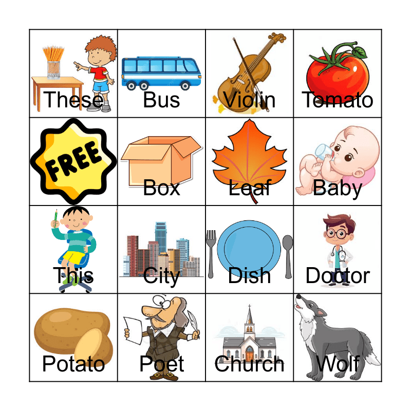 This bingo card has 16 images and 15 words: Poet, Doctor, Violin, These, This, Bus, Dish, Church, Box, Potato, Tomato, City, Baby, Leaf and Wolf.