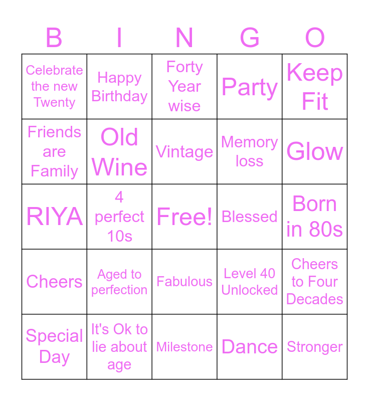 This bingo card has a free space and 25 words: Aged to perfection, Milestone, Vintage, Special Day, Keep Fit, Celebrate the new Twenty, Friends are Family, Happy Birthday, Blessed, Fabulous, Memory loss, RIYA, Level 40 Unlocked, Cheers to Four Decades, Old Wine, Two Times Twenty, Born in 80s, Forty Year wise, Glow, 4 perfect 10s, Stronger, It's Ok to lie about age, Cheers, Party and Dance.