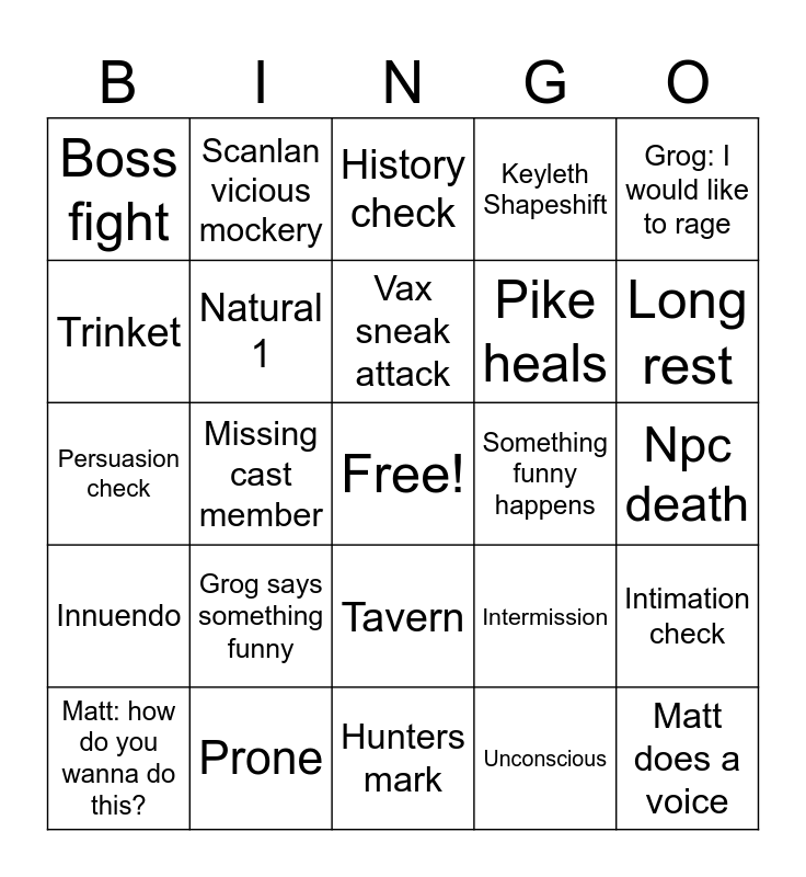 This bingo card has a free space and 39 words: Natural 20, Someone has a plan, Scanlan Bard song, Natural 1, Matt: how do you wanna do this?, Tavern, Vax sneak attack, Sam makes everyone laugh, Grog: I would like to rage, Innuendo, Missing cast member, Keyleth Shapeshift, Matt does a voice, Npc death, Something funny happens, Grog says something funny, Food arrives, Boss fight, Perception check, Intermission, Trinket, Hunters mark, Pike heals, Long rest, Matt: you can certainly try, Nature check, Religion check, Survival check, Athletics check, Scanlan vicious mockery, Stealth Check, Acrobatics Check, History check, Prone, Unconscious, Arcana check, Intimation check, Persuasion check and Saving throw.