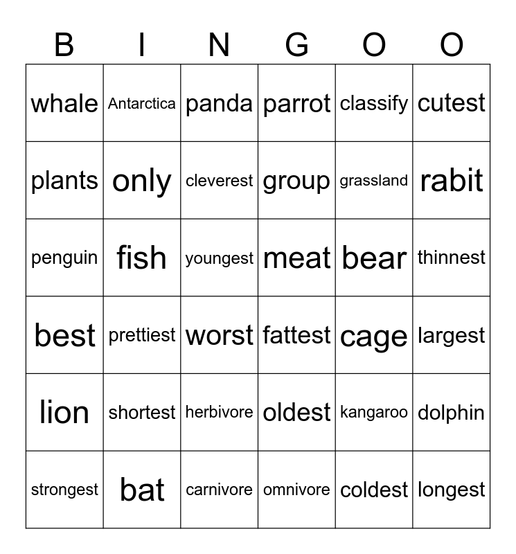 This bingo card has 36 words: oldest, herbivore, omnivore, plants, best, meat, only, carnivore, classify, kangaroo, rabit, parrot, dolphin, fish, group, whale, lion, bear, penguin, panda, youngest, prettiest, fattest, worst, cage, Antarctica, grassland, bat, cleverest, cutest, longest, strongest, largest, thinnest, shortest and coldest.