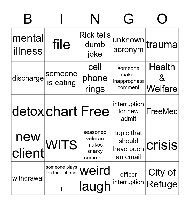 This bingo card has a free space and 24 words: WITS, someone plays on their phone l, cell phone rings, withdrawal, trauma, mental illness, discharge, file, interruption for new admit, seasoned veteran makes snarky comment, someone makes inappropriate comment, detox, topic that should have been an email, crisis, someone is eating, officer interruption, FreeMed, Rick tells dumb joke, Health & Welfare, chart, City of Refuge, new client, unknown acronym and weird laugh.