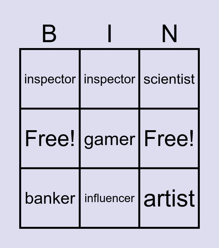 This bingo card has 12 words: Free!, influencer, artist, Free!, inspector, Free!, banker, gamer, scientist, inspector, gamer and scientist.