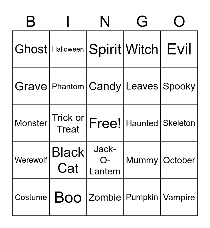 This bingo card has a free space and 24 words: Black Cat, Boo, Candy, Costume, Evil, Ghost, Grave, Halloween, Haunted, Jack-O-Lantern, Leaves, Monster, Mummy, October, Phantom, Pumpkin, Skeleton, Spirit, Spooky, Trick or Treat, Vampire, Werewolf, Witch and Zombie.