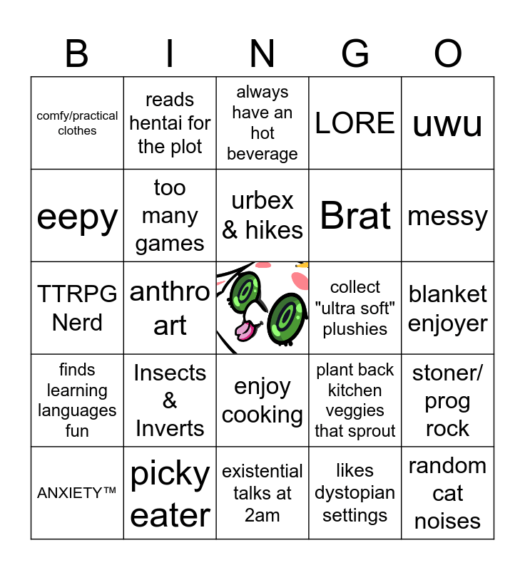 This bingo card has a free space and 24 words: Insects & Inverts, picky eater, urbex & hikes, ANXIETY™, uwu, comfy/practical clothes, eepy, reads hentai for the plot, collect "ultra soft" plushies, enjoy cooking, Brat, TTRPG Nerd, plant back kitchen veggies that sprout, stoner/ prog rock, too many games, likes dystopian settings, blanket enjoyer, always have an hot beverage, messy, anthro art, random cat noises, finds learning languages fun, LORE and existential talks at 2am.