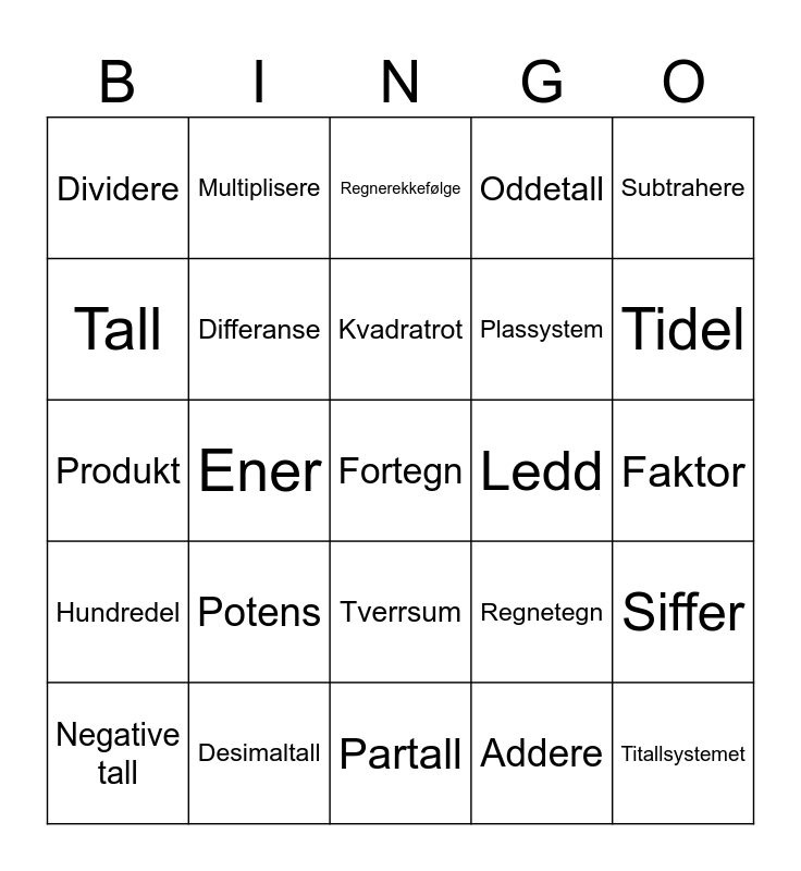 This bingo card has a free space and 24 words: Negative tall, Potens, Kvadratrot, Addere, Subtrahere, Dividere, Multiplisere, Regnerekkefølge, Ledd, Faktor, Produkt, Differanse, Regnetegn, Siffer, Tall, Desimaltall, Partall, Oddetall, Tidel, Hundredel, Ener, Tverrsum, Plassystem and Titallsystemet.