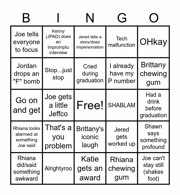 This bingo card has a free space and 24 words: That's a you problem, Alrightyroo, Cried during graduation, Rhiana did/said something awkward, OHkay, Joe tells everyone to focus, Jordan drops an "F" bomb, Kenny (JPAD) does an impromptu interview, SHABLAM, Brittany's iconic laugh, I already have my P number, Go on and get, Jered gets worked up, Shawn says something profound, Stop...just stop, Rhiana chewing gum, Had a drink before graduation, Jered tells a story/does impersonation, Brittany chewing gum, Joe gets a little Jeffco, Joe can't stay still (shakes foot), Rhiana looks alarmed at something Joe said, Tech malfunction and Katie gets an award.