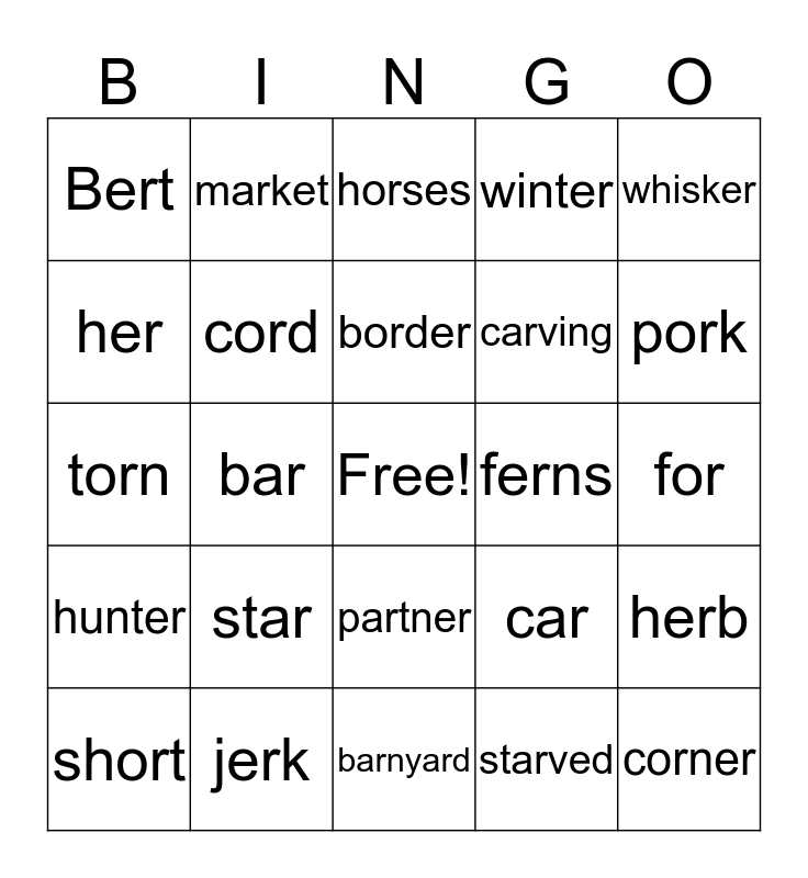 This bingo card has a free space and 24 words: star, jerk, border, short, whisker, Bert, her, market, ferns, partner, carving, torn, car, herb, cord, starved, for, horses, pork, bar, corner, hunter, winter and barnyard.