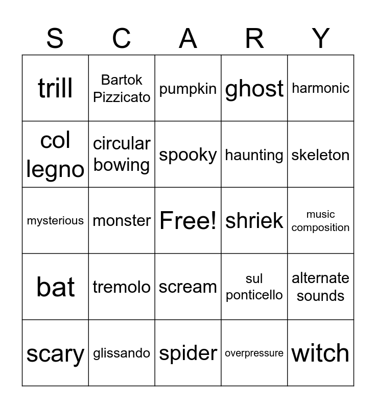 This bingo card has a free space and 24 words: tremolo, glissando, spooky, scary, harmonic, trill, col legno, Bartok Pizzicato, shriek, scream, haunting, mysterious, sul ponticello, alternate sounds, circular bowing, overpressure, music composition, pumpkin, skeleton, monster, witch, bat, ghost and spider.
