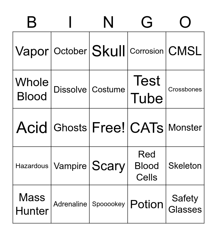 This bingo card has a free space and 51 words: Beaker, Safety Glasses, Witch, Spooookey, Vampire, Plasma, October, Spider, Whole Blood, Mass Spec, Dissolve, Corrosion, Skeleton, Red Blood Cells, Sciex, ECU-plasm, Costume, CATs, Cortisol, CMSL, Ghosts, Potion, Vapor, Test Tube, ION, ZONI, Crossbones, Zombie, Mass Hunter, Skull, Lazarus, Pumpkin, Mummy, !, Voltage, Adrenaline, Flammable, BATS, Specimen, Geralt, Monster, Hazardous, Toxic, Chemicals, Gloves, Halloween, Acid, Contamination, Poison, Scary and Sully.