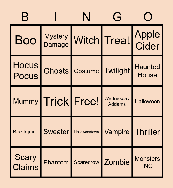 This bingo card has a free space and 37 words: Candy, Spooky, Pumpkin Spice, Ghosts, Thriller, Sweater, Costume, S'More, Apple Cider, Harry Potter, Trick, Treat, Monsters INC, Halloween, Hocus Pocus, Beetlejuice, Casper, Witch, Halloweentown, Wednesday Addams, Boo, Haunted House, Scary Claims, Scarecrow, Skeleton Crew, Zombie, Mystery Damage, Nightmare Negotiation, Goblin, Risk, Potion, Phantom, Mummy, Candy Corn is Nasty, Vampire, Twilight and Full Moon.