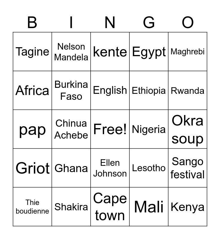 This bingo card has a free space and 24 words: Thie boudienne, Ghana, English, Mali, Maghrebi, Tagine, Nelson Mandela, kente, Nigeria, Okra soup, pap, Burkina Faso, Lesotho, Sango festival, Africa, Shakira, Cape town, Egypt, Rwanda, Griot, Chinua Achebe, Ellen Johnson, Ethiopia and Kenya.