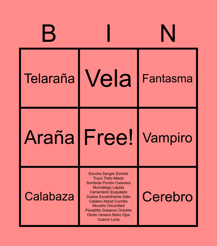 This bingo card has a free space and 9 words: Calabaza, Fantasma, Vela, Araña, Telaraña, Vampiro, Cerebro, Bruja and Escoba Sangre Zombie Truco Trato Miedo Sombras Poción Calavera Murciélago Lápida Cementerio Esqueleto Sustos Escalofriante Gato Caldero Ataúd Cuchillo Moustro Oscuridad Pesadilla Gusanos Octubre Otoño Veneno Búho Ojos Cuervo Luna.