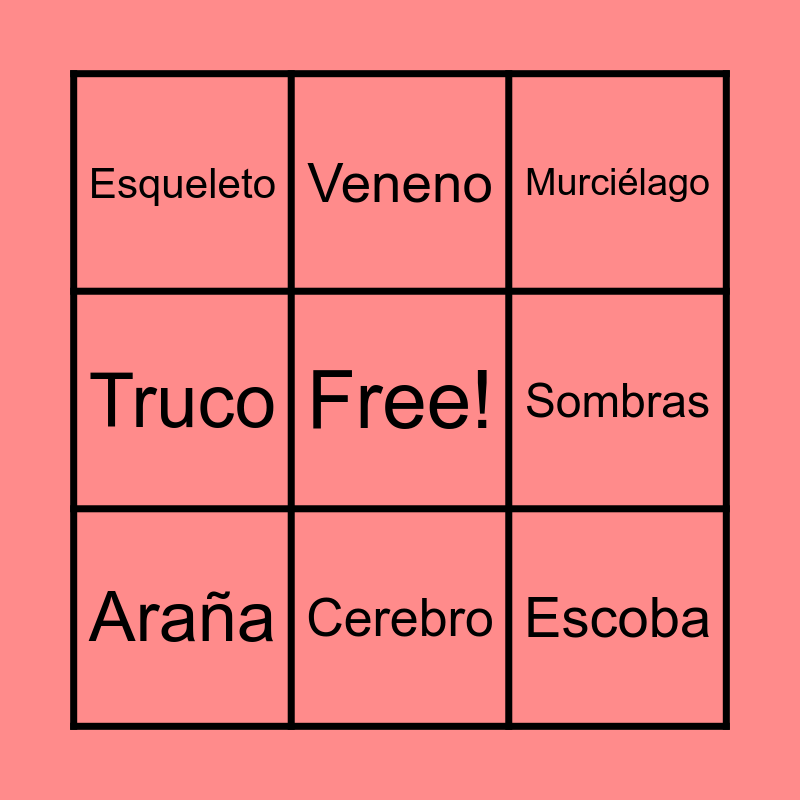 This bingo card has a free space and 38 words: Calabaza, Fantasma, Vela, Araña, Telaraña, Vampiro, Cerebro, Bruja, Escoba, Sangre, Zombie, Truco, Trato, Miedo, Sombras, Poción, Calavera, Murciélago, Lápida, Cementerio, Esqueleto, Sustos, Escalofriante, Gato, Caldero, Ataúd, Cuchillo, Moustro, Oscuridad, Pesadilla, Gusanos, Octubre, Otoño, Veneno, Búho, Ojos, Cuervo and Luna.