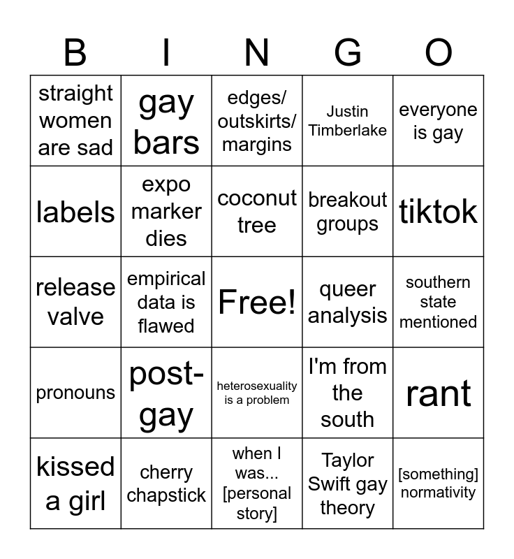 This bingo card has a free space and 29 words: kissed a girl, Trump, empirical data is flawed, brat summer, straight women are sad, edges/ outskirts/ margins, expo marker dies, post-gay, queer analysis, cherry chapstick, southern state mentioned, [something] normativity, when I was...[personal story], Taylor Swift gay theory, tiktok, don't call your husband "partner", heterosexuality is a problem, pronouns, everyone is gay, release valve, I'm from the south, Kamala, breakout groups, labels, Justin Timberlake, gay bars, rant, coconut tree and [something] categories.