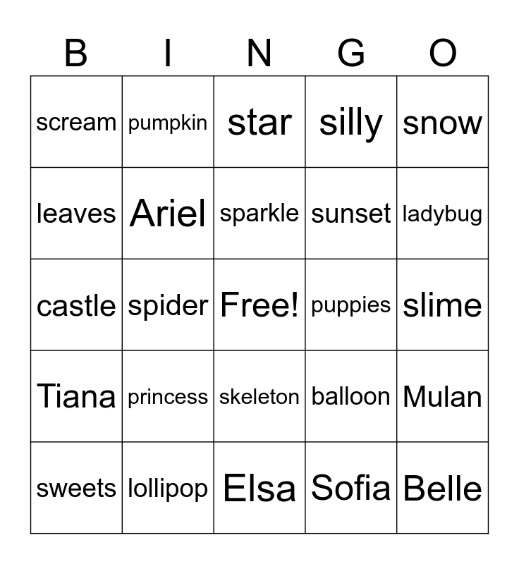 This bingo card has a free space and 24 words: princess, lollipop, sparkle, sweets, snow, scream, leaves, pumpkin, puppies, skeleton, sunset, castle, balloon, Mulan, Ariel, Sofia, slime, star, ladybug, spider, Belle, Tiana, silly and Elsa.