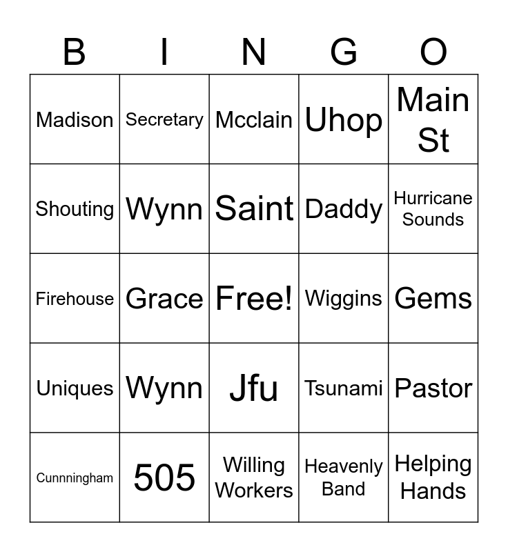 This bingo card has a free space and 29 words: Cunnningham, Bailey, Grace, Mccullough, Madison, Mcclain, Wynn, Wynn, Wiggins, 505, Gems, Helping Hands, Willing Workers, Heavenly Band, Hurricane Sounds, Queens, Jfu, Uniques, Main St, Firehouse, Tsunami, Deacons, Daddy, Shouting, Uhop, Secretary, Pastor, Saint and Blessed.