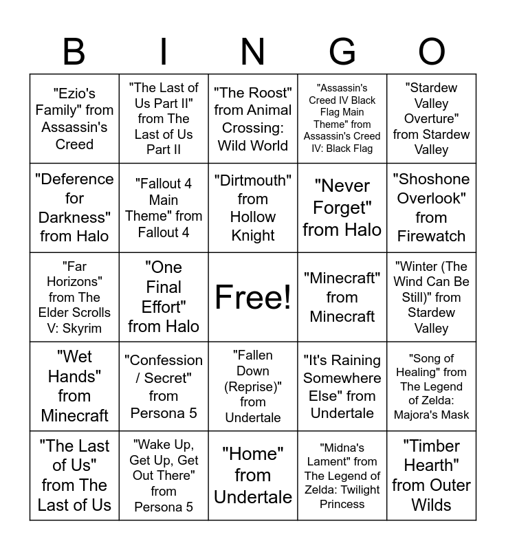 This bingo card has a free space and 56 words: "Secunda" from The Elder Scrolls V: Skyrim, "The Last of Us" from The Last of Us, "Sweden" from Minecraft, "Ezio's Family" from Assassin's Creed, "Home" from Undertale, "1:00 A.M." from Animal Crossing: New Leaf, "Fallout 4 Main Theme" from Fallout 4, "Dance of the Moonlight Jellies" from Stardew Valley, "Never Forget" from Halo, "The Streets of Whiterun" from The Elder Scrolls V: Skyrim, "Assassin's Creed IV Black Flag Main Theme" from Assassin's Creed IV: Black Flag, "Moog City" from Minecraft, "The Choice" from The Last of Us, "Snowy" from Undertale, "2:00 A.M." from Animal Crossing: New Leaf, "City of Tears" from Hollow Knight, "Stardew Valley Overture" from Stardew Valley, "One Final Effort" from Halo, "From Past to Present" from The Elder Scrolls V: Skyrim, "Timber Hearth" from Outer Wilds, "Minecraft" from Minecraft, "All Gone (No Escape)" from The Last of Us, "It's Raining Somewhere Else" from Undertale, "The Roost" from Animal Crossing: Wild World, "By Your Side" from Omori, "Dirtmouth" from Hollow Knight, "Unforgotten" from Halo, "Awake" from The Elder Scrolls V: Skyrim, "Shoshone Overlook" from Firewatch, "Subwoofer Lullaby" from Minecraft, "The Path (A New Beginning)" from The Last of Us, "Undertale" from Undertale, "7:00 P.M." from Animal Crossing: New Leaf, "Lost Library" from Omori, "Winter (The Wind Can Be Still)" from Stardew Valley, "Deference for Darkness" from Halo, "Far Horizons" from The Elder Scrolls V: Skyrim, "Promise (Reprise)" from Silent Hill 2, "Wet Hands" from Minecraft, "The Last of Us Part II" from The Last of Us Part II, "Fallen Down (Reprise)" from Undertale, "4:00 A.M." from Animal Crossing: New Leaf, "Duet" from Omori, "Thorofare Hike" from Firewatch, "Getaway & Arrest" from Persona 5, "Confession / Secret" from Persona 5, "Wake Up, Get Up, Get Out There" from Persona 5, "Life Goes On" from Persona 5, "Bubblegum K.K." from Animal Crossing: New Horizons, "Zelda's Lullaby" from The Legend of Zelda: Ocarina of Time, "Midna's Lament" from The Legend of Zelda: Twilight Princess, "Bob-Omb Battlefield" from Super Mario 64, "Super Mario Galaxy 2 Theme" from Super Mario Galaxy 2, "Baby Park" from Mario Kart: Double Dash!!, "Song of Healing" from The Legend of Zelda: Majora's Mask and "Night Market" from Stardew Valley.
