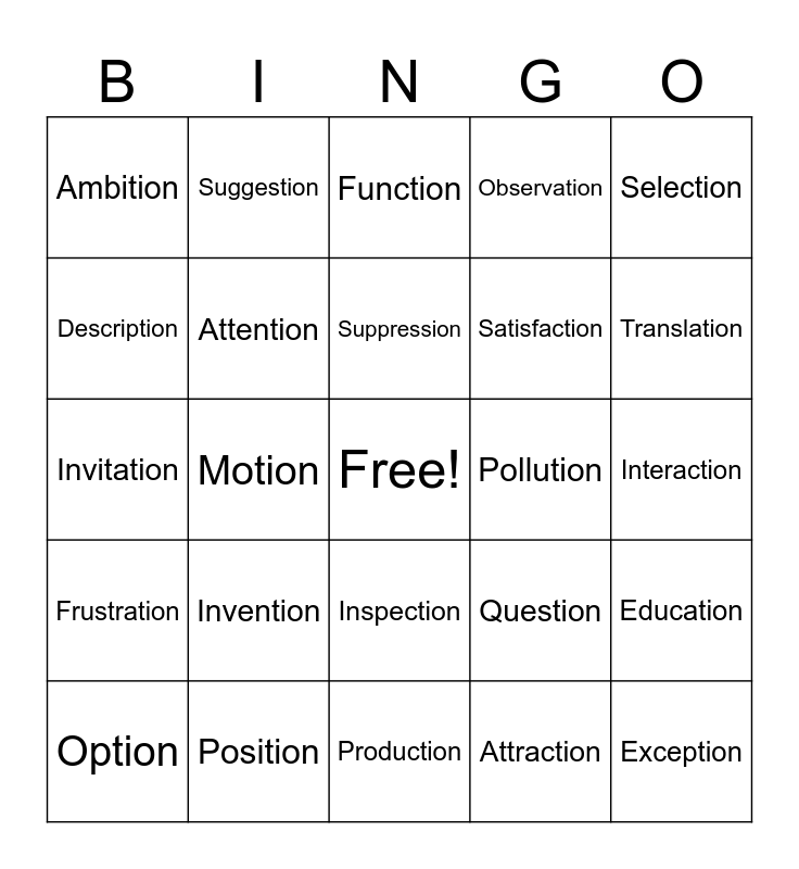 This bingo card has a free space and 60 words: Graduation, Position, Vision, Frustration, Attraction, Collection, Attention, Transmission, Satisfaction, Transition, Observation, Relation, Description, Location, Extension, Ambition, Exception, Selection, Construction, Suppression, Pollution, Function, Option, Education, Reaction, Condition, Mention, Revolution, Translation, Resolution, Action, Fiction, Detection, Creation, Suggestion, Nation, Information, Motion, Protection, Invitation, Adoption, Invention, Interaction, Generation, Question, Instruction, Solution, Election, Explosion, Inspection, Production, Addition, Tradition, Operation, Subscription, Emotion, Direction, Definition, Situation and Illustration.