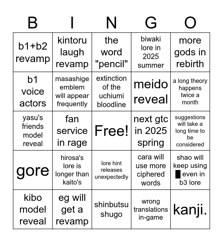 This bingo card has a free space and 24 words: hirosa's lore is longer than kaito's, eg will get a revamp, extinction of the uchiumi bloodline, kibo model reveal, more gods in rebirth, b1+b2 revamp, b1 voice actors, kintoru laugh revamp, next gtc in 2025 spring, lore hint releases unexpectedly, meido reveal, yasu's friends model reveal, cara will use more ciphered words, shao will keep using █ even in b3 lore, masashige emblem will appear frequently, wrong translations in-game, suggestions will take a long time to be considered, the word "pencil", a long theory happens twice a month, fan service in rage, kanji., gore, biwaki lore in 2025 summer and shinbutsu shugo.