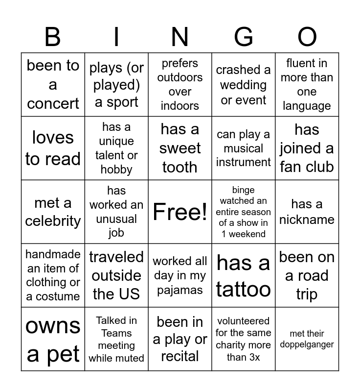 This bingo card has a free space and 24 words: traveled outside the US, Talked in Teams meeting while muted, has a sweet tooth, owns a pet, fluent in more than one language, been to a concert, loves to read, plays (or played) a sport, binge watched an entire season of a show in 1 weekend, worked all day in my pajamas, can play a musical instrument, met a celebrity, has a tattoo, been on a road trip, has a unique talent or hobby, volunteered for the same charity more than 3x, has a nickname, prefers outdoors over indoors, has joined a fan club, has worked an unusual job, met their doppelganger, handmade an item of clothing or a costume, crashed a wedding or event and been in a play or recital.