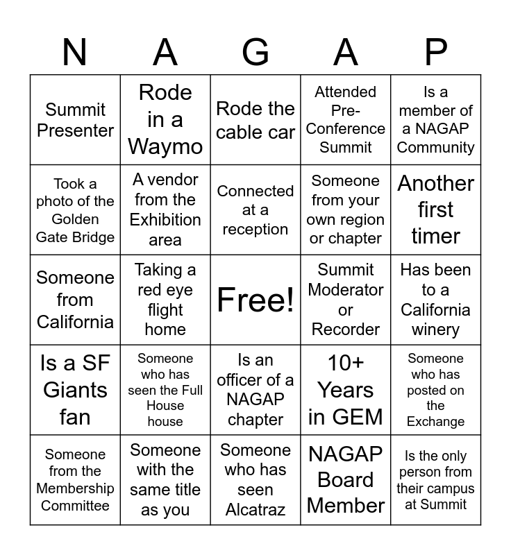 This bingo card has a free space and 27 words: 10+ Years in GEM, NAGAP Leadership Academy Participant/Alumni, Someone from your own region or chapter, Someone who has seen Alcatraz, Took a photo of the Golden Gate Bridge, Rode the cable car, Rode in a Waymo, Is a SF Giants fan, Summit Moderator or Recorder, Someone who has posted on the Exchange, Someone from California, Attended Pre-Conference Summit, Someone from the Membership Committee, Someone with the same title as you, Another first timer, Someone who has been to at least three NAGAP Conferences, A vendor from the Exhibition area, Connected at a reception, Someone who has seen the Full House house, Summit Presenter, Has been to a California winery, NAGAP Board Member, Taking a red eye flight home, Is the only person from their campus at Summit, Is an officer of a NAGAP chapter, Is a member of a NAGAP Community and Has listened to the NAGAP Podcast.
