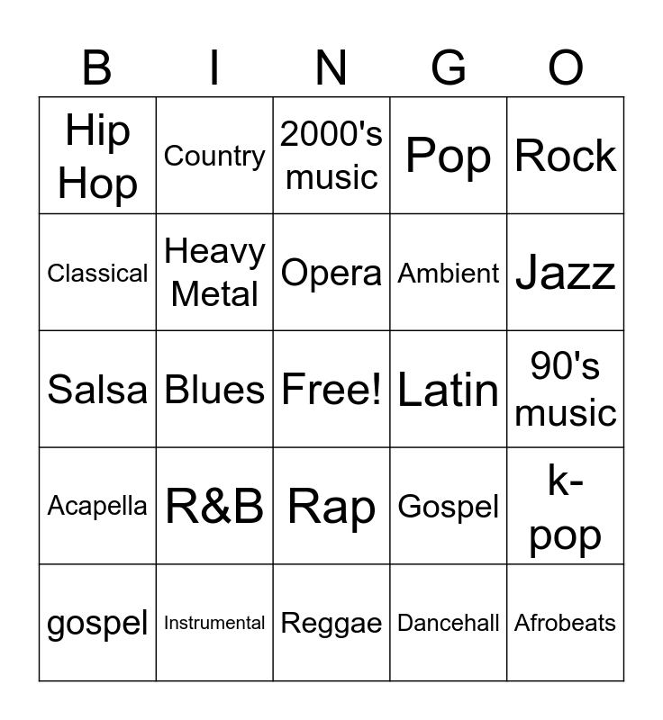 This bingo card has a free space and 24 words: R&B, Instrumental, Opera, gospel, Rock, Hip Hop, Classical, Country, Latin, Rap, Ambient, Salsa, Gospel, k-pop, Heavy Metal, Dancehall, 90's music, 2000's music, Jazz, Blues, Afrobeats, Acapella, Pop and Reggae.