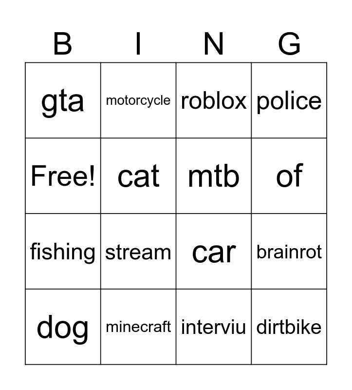 This bingo card has 16 words: minecraft, brainrot, roblox, gta, fishing, motorcycle, car, interviu, Free!, cat, dog, police, stream, of, mtb and dirtbike.
