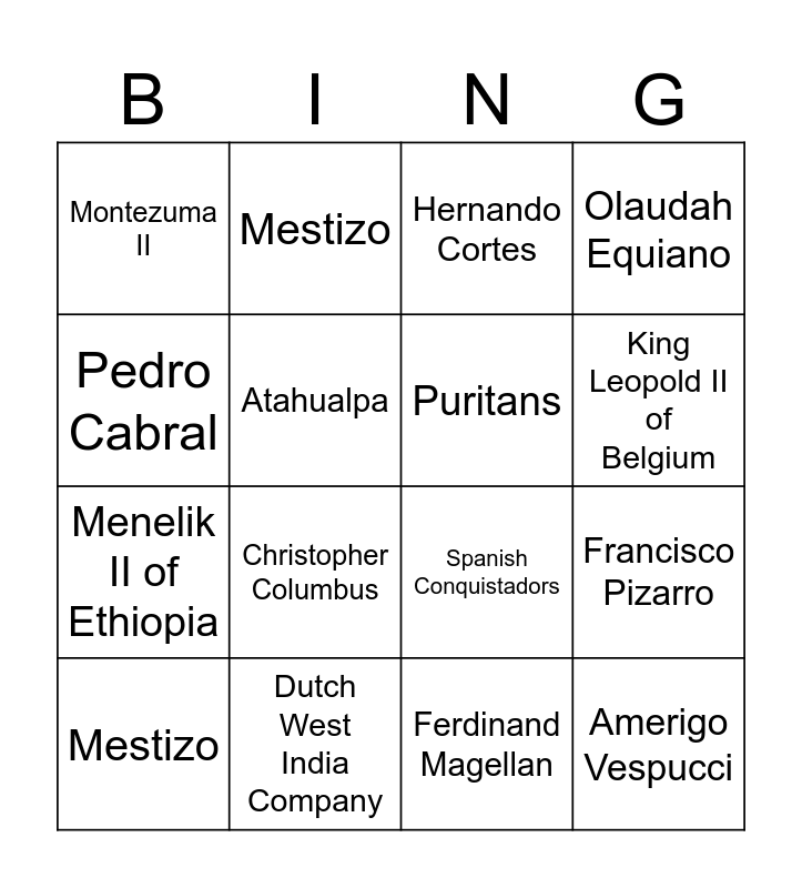This bingo card has 18 words: Christopher Columbus, Amerigo Vespucci, Hernando Cortes, Montezuma II, Spanish Conquistadors, Olaudah Equiano, Mestizo, Mestizo, King Leopold II of Belgium, Menelik II of Ethiopia, Ferdinand Magellan, Pedro Cabral, Francisco Pizarro, Atahualpa, Puritans, Pilgrims, Dutch West India Company and Mestizo.