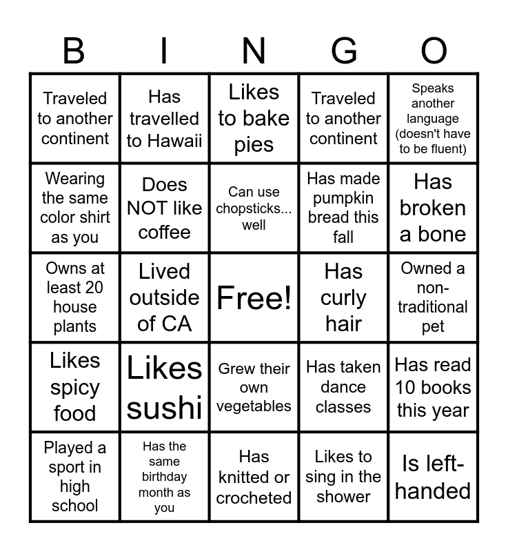 This bingo card has a free space and 30 words: Has the same birthday month as you, Ate a taco this week, Lived outside of CA, Won a prize at the Kern County Fair, Traveled to another continent, Likes to bake pies, Does NOT like coffee, Grew their own vegetables, Has curly hair, Has knitted or crocheted, Owned a non-traditional pet, Is left-handed, Likes to sing in the shower, Likes roller coasters, Has broken a bone, Has at least 4 siblings, Has taken dance classes, Likes spicy food, Likes sushi, Speaks another language (doesn't have to be fluent), Owns at least 20 house plants, Ever had more than 3 pets at once, Has travelled to Hawaii, Has made pumpkin bread this fall, Wearing the same color shirt as you, Traveled to another continent, Has read 10 books this year, Played a sport in high school, Can use chopsticks... well and Has been a teacher.