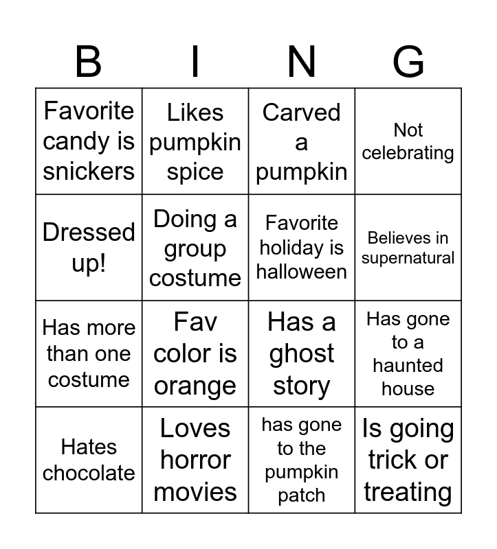 This bingo card has 16 words: Loves horror movies, Has gone to a haunted house, Carved a pumpkin, Favorite candy is snickers, Has more than one costume, Likes pumpkin spice, Has a ghost story, has gone to the pumpkin patch, Dressed up!, Doing a group costume, Hates chocolate, Not celebrating, Fav color is orange, Believes in supernatural, Favorite holiday is halloween and Is going trick or treating.