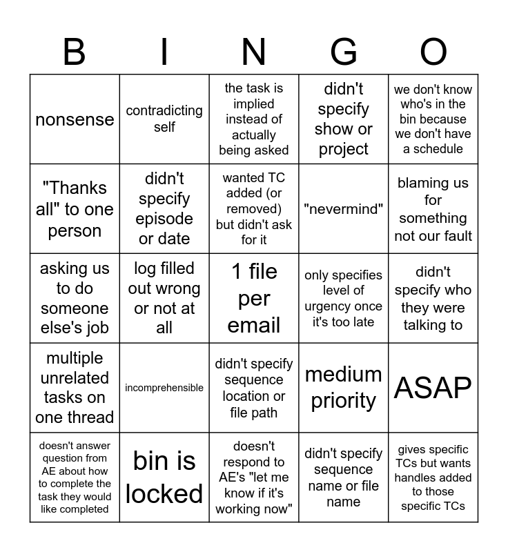 This bingo card has 26 words: didn't specify sequence location or file path, didn't specify sequence name or file name, wanted TC added (or removed) but didn't ask for it, bin is locked, we don't know who's in the bin because we don't have a schedule, nonsense, "Thanks all" to one person, contradicting self, didn't specify who they were talking to, medium priority, "nevermind", asking us to do someone else's job, ASAP, doesn't answer question from AE about how to complete the task they would like completed, log filled out wrong or not at all, asking us to do something impossible, didn't specify show or project, multiple unrelated tasks on one thread, the task is implied instead of actually being asked, 1 file per email, blaming us for something not our fault, doesn't respond to AE's "let me know if it's working now", only specifies level of urgency once it's too late, incomprehensible, didn't specify episode or date and gives specific TCs but wants handles added to those specific TCs.