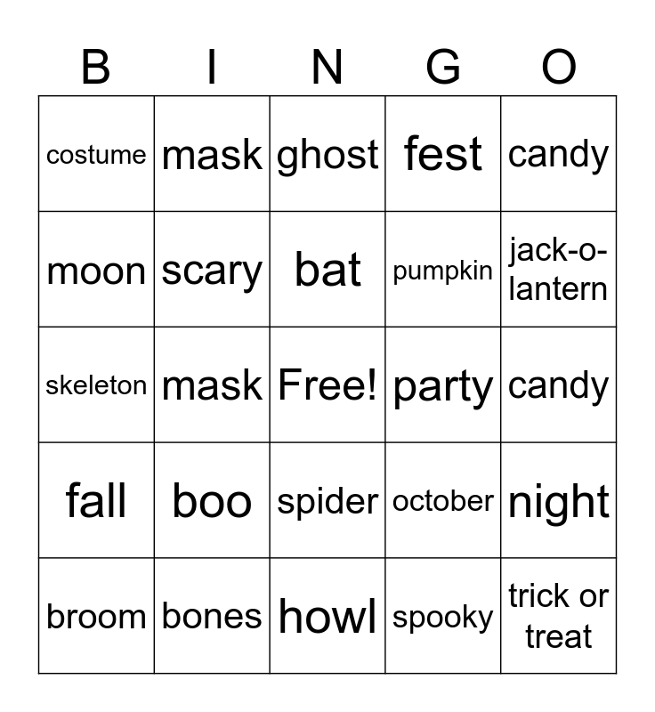This bingo card has a free space and 24 words: boo, bones, bat, broom, candy, costume, moon, mask, party, spider, pumpkin, skeleton, october, night, scary, spooky, candy, ghost, jack-o-lantern, mask, trick or treat, fall, fest and howl.