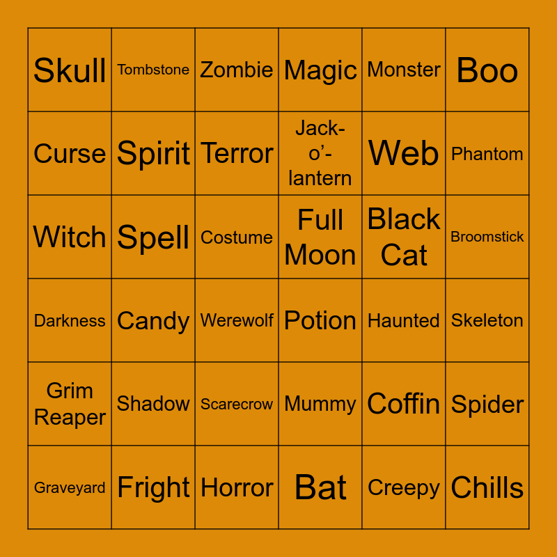 This bingo card has 45 words: Ghost, Witch, Vampire, Werewolf, Mummy, Skeleton, Zombie, Goblin, Monster, Potion, Magic, Spell, Broomstick, Black Cat, Bat, Haunted, Spider, Web, Pumpkin, Jack-o’-lantern, Tombstone, Graveyard, Coffin, Skull, Mask, Costume, Shadow, Blood, Darkness, Full Moon, Trick-or-treat, Candy, Horror, Creepy, Fright, Phantom, Scarecrow, Chills, Grim Reaper, Spirit, Boo, Terror, Midnight, Curse and Eerie.