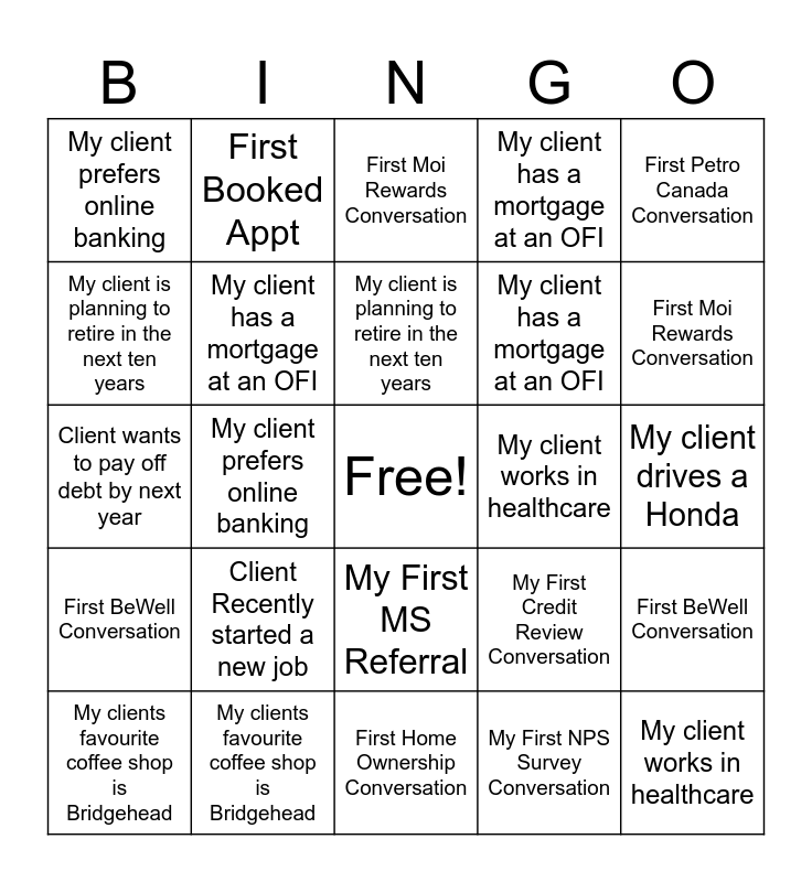 This bingo card has a free space and 84 words: First Home Ownership Conversation, First Petro Canada Conversation, First Moi Rewards Conversation, First BeWell Conversation, First Shop Plus Conversation, First Investment Review Conversation, My First IRP Referral, My First MS Referral, My First NPS Survey Conversation, First MyAdvisor Completed, Added a Goal in MyAdvisor with my Client, Updated Cash Flow in MyAdvisor with my Client, My client has a mortgage at an OFI, My client works in healthcare, My client attended a sports game in the last month, My client prefers online banking, My clients favourite coffee shop is Bridgehead, My client is planning to retire in the next ten years, My client has children under 18, My client drives a Honda, My client signed up for NOMI, My client has a mortgage at an OFI, My client works in healthcare, My client attended a sports game in the last month, My client prefers online banking, My clients favourite coffee shop is Bridgehead, My client is planning to retire in the next ten years, My client has children under 18, My client drives a Honda, My client signed up for NOMI, Client Recently started a new job, client wants to travel to disneyland, Client has a new family member, Client wants to pay off debt by next year, Client is considering starting a new business, Client is looking to build an emergency fund, First Home Ownership Conversation, First Petro Canada Conversation, First Moi Rewards Conversation, First BeWell Conversation, First Shop Plus Conversation, First Investment Review Conversation, My First IRP Referral, My First MS Referral, My First NPS Survey Conversation, First VP Conversation, First Booked Appt, First Digital Demo, First O&O Conversation, First Credit Card Review, My client activated their VVD, My First Credit Review Conversation, My client has a mortgage at an OFI, My client works in healthcare, My client attended a sports game in the last month, My client prefers online banking, My clients favourite coffee shop is Bridgehead, My client is planning to retire in the next ten years, My client has children under 18, My client drives a Honda, My client signed up for NOMI, Client Recently started a new job, client wants to travel to disneyland, Client has a new family member, Client wants to pay off debt by next year, Client is considering starting a new business, Client is looking to build an emergency fund, First Home Ownership Conversation, First Petro Canada Conversation, First Moi Rewards Conversation, First BeWell Conversation, First Shop Plus Conversation, First Investment Review Conversation, My First IRP Referral, My First MS Referral, My First NPS Survey Conversation, My Client is Selling Their Home Within the Next Year, First VP Conversation, First Booked Appt, First Digital Demo, First O&O Conversation, First Credit Card Review, My client activated their VVD and My First Credit Review Conversation.