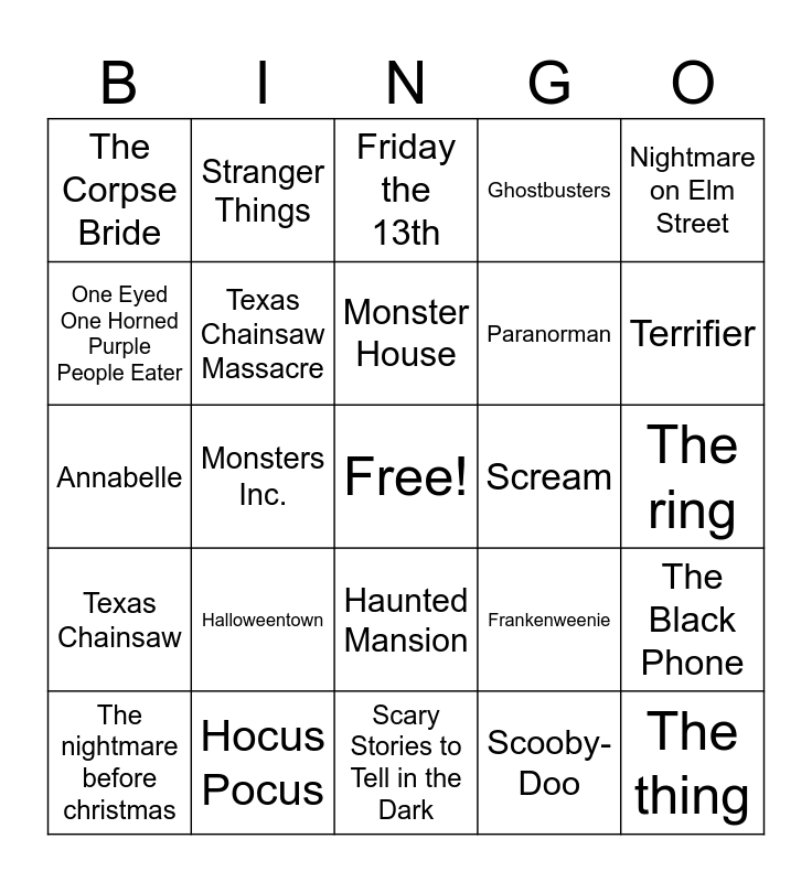 This bingo card has a free space and 29 words: The nightmare before christmas, Halloween, Monsters Inc., Coraline, The Corpse Bride, Friday the 13th, Texas Chainsaw Massacre, Halloweentown, Scream, Hocus Pocus, The ring, The thing, Scary Stories to Tell in the Dark, Scooby-Doo, Terrifier, It, Haunted Mansion, Texas Chainsaw, Nightmare on Elm Street, Annabelle, Frankenweenie, Casper, Paranorman, One Eyed One Horned Purple People Eater, Ghostbusters, Stranger Things, The Black Phone, Monster House and Beetlejuice.