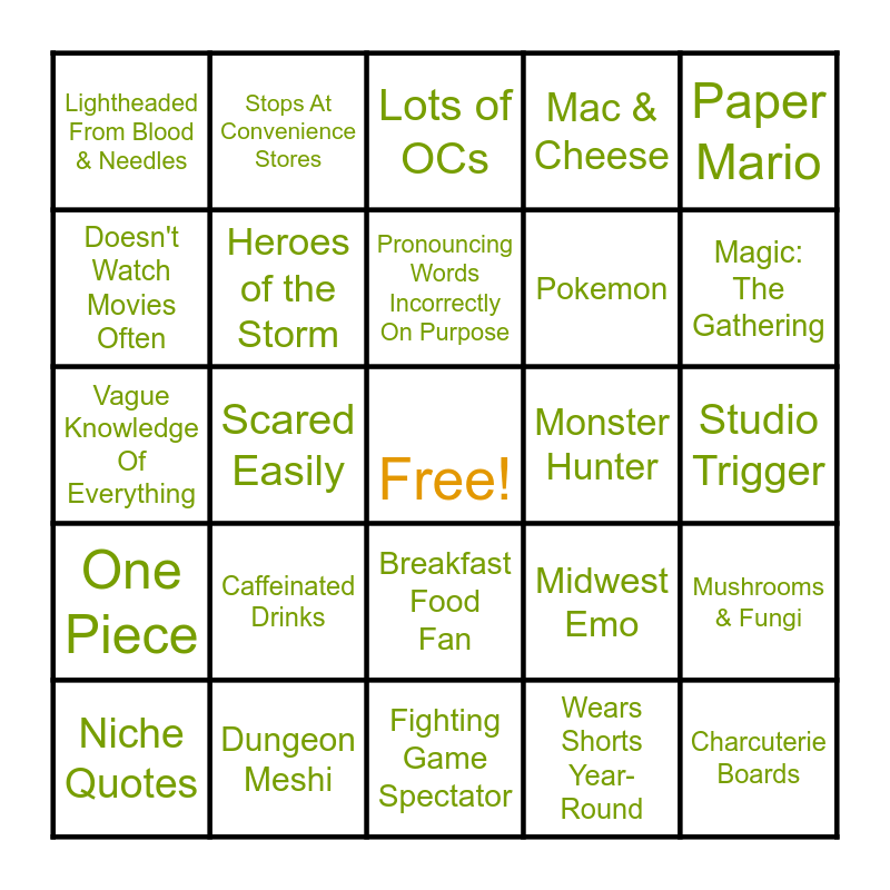 This bingo card has a free space and 24 words: Caffeinated Drinks, Dungeon Meshi, Pronouncing Words Incorrectly On Purpose, Niche Quotes, Paper Mario, Lightheaded From Blood & Needles, Doesn't Watch Movies Often, Stops At Convenience Stores, Monster Hunter, Breakfast Food Fan, Pokemon, Vague Knowledge Of Everything, Midwest Emo, Mushrooms & Fungi, Heroes of the Storm, Wears Shorts Year-Round, Studio Trigger, Lots of OCs, Magic: The Gathering, Scared Easily, Charcuterie Boards, One Piece, Mac & Cheese and Fighting Game Spectator.