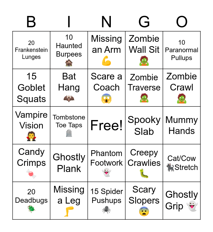 This bingo card has a free space and 30 words: Missing a Leg 🦵, Haunted Bells🔔, Tombstone Toe Taps 🪦, Robot Climb 🤖, 20 Frankenstein Lunges, Missing an Arm 💪, Bat Hang 🦇, Phantom Footwork 👻, Spooky Slab, 15 Spider Pushups🕷️, Mummy Hands, Ghostly Grip 👻, Scary Slopers😨, Hangman (1 min deadhang), Zombie Crawl 🧟, Vanishing Holds🔮, Creepy Crawlies 🐛, Candy Crimps 🍬, Ghostly Plank, 10 Paranormal Pullups, Vampire Vision🧛, Dyno Jumpscare, 10 Haunted Burpees 🏚️, Zombie Traverse 🧟, 15 Goblet Squats, Zombie Wall Sit 🧟, Cat/Cow🐈⬛Stretch, 20 Deadbugs 🪲, Scare a Coach 😱 and Wear a Costume.