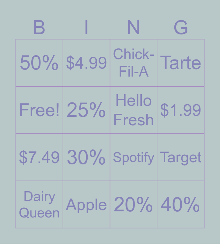 This bingo card has 16 words: Apple, Target, Chick-Fil-A, 50%, $7.49, $4.99, Spotify, 20%, Free!, 25%, Dairy Queen, Tarte, 30%, $1.99, Hello Fresh and 40%.