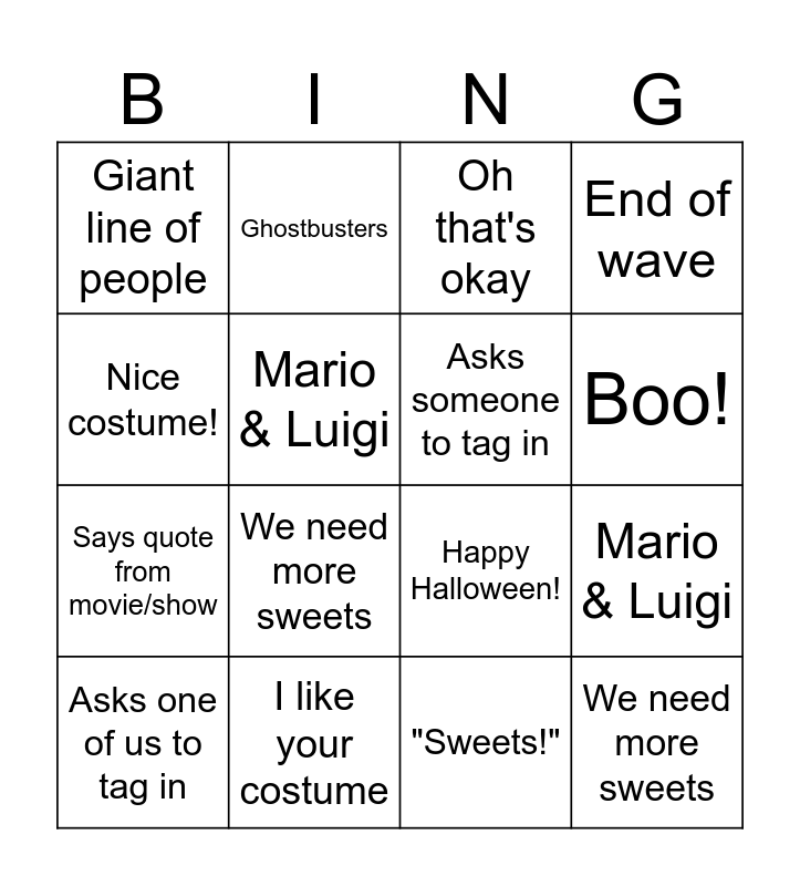 This bingo card has 22 words: I like your costume, 2 minutes with no people, Ghostbusters, Describes costume to us, Mario & Luigi, Asks someone to tag in, Giant line of people, Oh that's okay, Happy Halloween!, We need more sweets, Says quote from movie/show, End of wave, Boo!, You're welcome, "Sweets!", I like your mask, Mario & Luigi, Asks one of us to tag in, We need more sweets, Nice costume!, Boo! and 2 minutes of nothing.