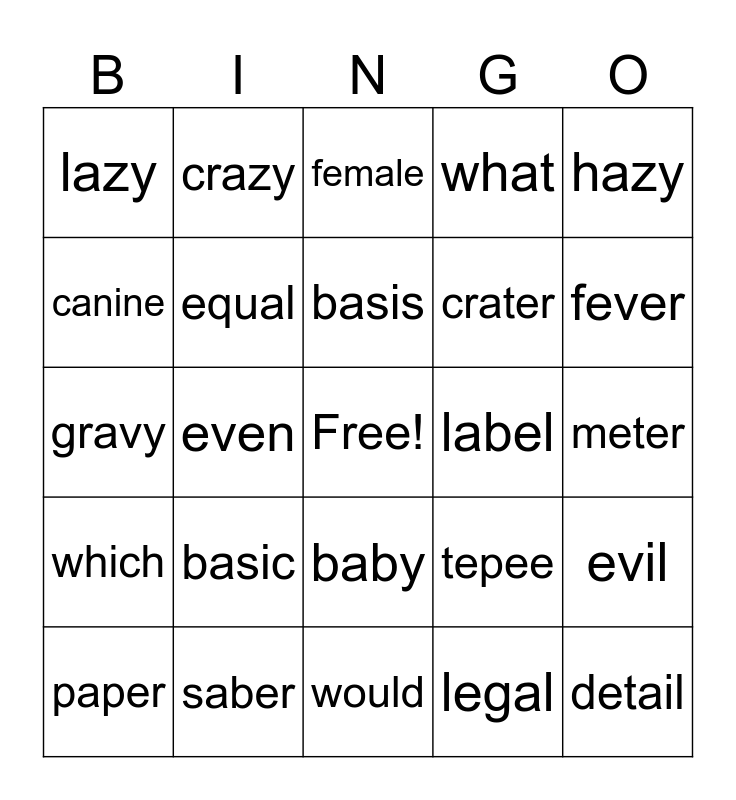 This bingo card has a free space and 24 words: basic, saber, basis, paper, hazy, lazy, canine, crazy, label, baby, crater, gravy, tepee, evil, equal, legal, meter, female, fever, even, detail, which, what and would.