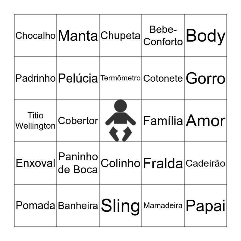 This bingo card has a free space and 70 words: Algodão, Amor, Andador, Babador, Banheira, Bebê, Bebe-Conforto, Berço, Body, Brinquedo, Cadeirão, Carrinho, Chocalho, Chupeta, Chuquinha, Cobertor, Colinho, Cotonete, Doula, Enxoval, Família, Fralda, Gorro, Leite, Lencinho, Luvinha, Macacão, Madrinha, Mamadeira, Mamãe, Manta, Meia, Mingau, Móbile, Moisés, Mordedor, Naninha, Nathan, Ofurô, Padrinho, Pagão, Paninho de Boca, Papai, Papinha, Peito, Pelúcia, Pomada, Priminha, Priminhos, Regurgitador, Rolinho, Sabonete, Sapatinho, Shantala, Sling, Talco, Termômetro, Titia Geysi, Titia Wanessa, Titio Anderson, Titio Wellington, Toalha, Trocador, Vacina, Vovó Maria, Vovó Marlete, Vovô Paulo, Vovô Pedro, Vovó Roseli and Vovô Tony.