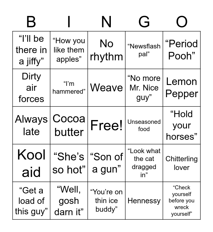 This bingo card has a free space and 54 words: Fried Chicken, Kool aid, Doesn’t know their dad, Green bean casserole, “Son of a gun”, “Just hold your horses”, “Newsflash pal”, “You’re barking up the wrong tree”, Dirty air forces, Snow bunny, “I’ll be there in a jiffy”, “See you later alligator”, “Well, gosh darn it”, “Get a load of this guy”, “Fosho”, “You’re on thin ice buddy”, “Check yourself before you wreck yourself”, “No more Mr. Nice guy”, “Listen here pal”, “Hold your horses”, “Look what the cat dragged in”, Shrimp and Grits, Unseasoned food, “Period Pooh”, “I’m finna”, “How you like them apples”, Starbucks, Corner store, Black n Mild’s, Hennessy, Cocaine, Lean, Drug dealers, Drug users, No rhythm, “I’m on the way”, Always late, Chitterling lover, “Bussin”, “I’m hammered”, High cholesterol, Food stamps, Never changes smoke detector battery, “Hey dude”, “She’s so hot”, “You got McDonalds money”, Karen, Extensions, Weave, Cocoa butter, Lemon Pepper, Raves, Hiking and Mulatto.