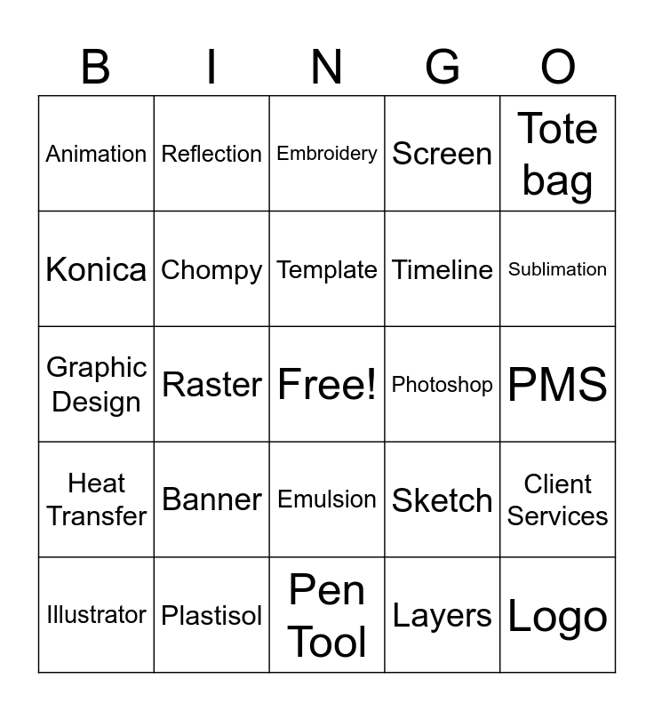 This bingo card has a free space and 29 words: Illustrator, Vector, Raster, Stage, Animation, Embroidery, Chompy, Banner, Photoshop, Plastisol, PMS, Logo, Pen Tool, Layers, Sublimation, Squeegee, Emulsion, Heat Transfer, Tote bag, Graphic Design, Sketch, Stickers, Timeline, Konica, Screen, Reflection, Client Services, Template and Undo (Command Z).