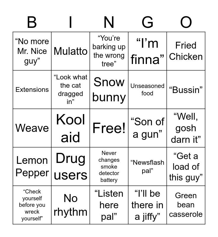 This bingo card has a free space and 55 words: “You’re on thin ice buddy”, “Check yourself before you wreck yourself”, “Why I oughta”, “No more Mr. Nice guy”, “Listen here pal”, “Hold your horses”, “Look what the cat dragged in”, Shrimp and Grits, Unseasoned food, “Period Pooh”, “I’m finna”, “How you like them apples”, Starbucks, Corner store, Black n Mild’s, Hennessy, Fried Chicken, Kool aid, Doesn’t know their dad, Green bean casserole, “Son of a gun”, “Just hold your horses”, “Newsflash pal”, “You’re barking up the wrong tree”, Dirty air forces, Snow bunny, “I’ll be there in a jiffy”, “See you later alligator”, “Well, gosh darn it”, “Get a load of this guy”, “Fosho”, “She’s so hot”, “You got McDonalds money”, Karen, Extensions, Weave, Cocoa butter, Lemon Pepper, Raves, Hiking, Mulatto, Cocaine, Lean, Drug dealers, Drug users, No rhythm, “I’m on the way”, Always late, Chitterling lover, “Bussin”, “I’m hammered”, High cholesterol, Food stamps, Never changes smoke detector battery and “Hey dude”.