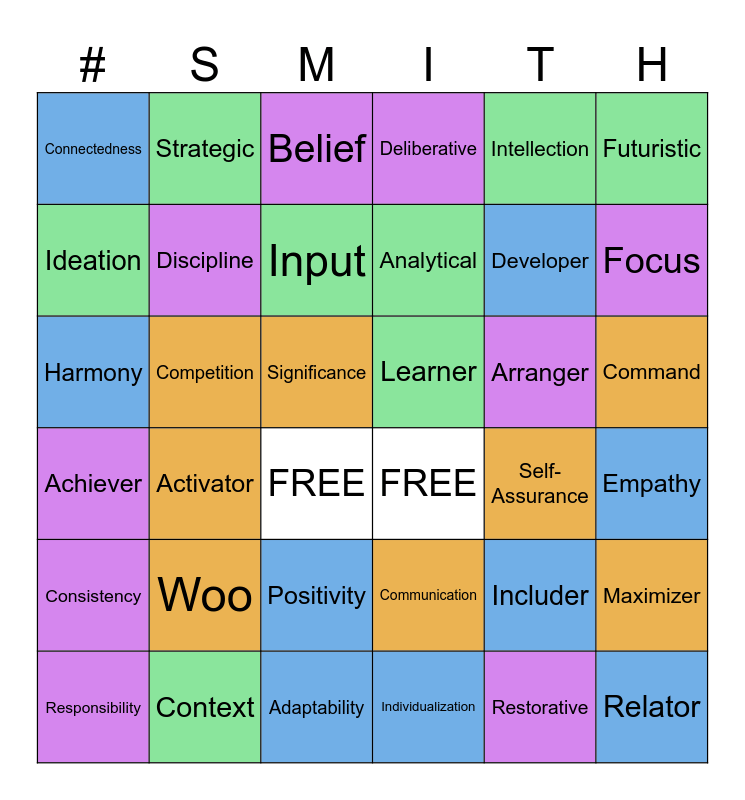 This bingo card has 36 words: Achiever, Activator, Adaptability, Analytical, Arranger, Command, Connectedness, Context, Belief, Communication, Developer, Futuristic, Consistency, Competition, Input, Deliberative, Includer, Empathy, Ideation, Discipline, FREE, FREE, Self-Assurance, Maximizer, Harmony, Strategic, Significance, Individualization, Intellection, Focus, Responsibility, Woo, Positivity, Learner, Restorative and Relator.