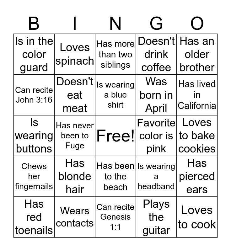 This bingo card has a free space and 24 words: Has blonde hair, Wears contacts, Is wearing a blue shirt, Has red toenails, Has an older brother, Is in the color guard, Can recite John 3:16, Loves spinach, Favorite color is pink, Has been to the beach, Was born in April, Is wearing buttons, Is wearing a headband, Has pierced ears, Doesn't eat meat, Plays the guitar, Loves to bake cookies, Has more than two siblings, Has lived in California, Has never been to Fuge, Loves to cook, Chews her fingernails, Doesn't drink coffee and Can recite Genesis 1:1.